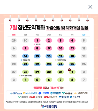 2025년 7월 1일부터 11일까지 신청이 가능합니다. 청년도약계좌 신청은 각 은행의 앱 또는 인터넷뱅킹에서 진행하며, 자격 검토 이후 실제 계좌 개설이 확정됩니다.